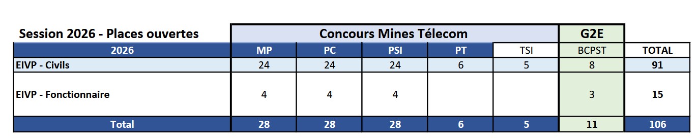 - Filières MP, PC, PSI, TSI et PT : recrutement via le concours Mines-Télécom (épreuves écrites de la banque de concours Mines-Ponts | épreuves orales du concours Mines-Télécom ) → notice 2026 du concours Mines-Télécom